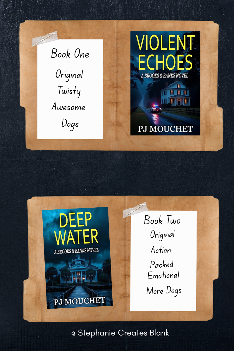 Agent Jackson Brooks with K9 Ruby and Agent Willow Banks with K9 Ranger are multifaceted characters. Thoroughly thought-out characters within their respective stories to solve the major crime in which brings them together. Even though a reader can enjoy the books separately, I recommend reading both Violent Echoes and Deep Water for full submersion within the stories. PJ Mouchet does a great job referring to events previously and builds upon them.